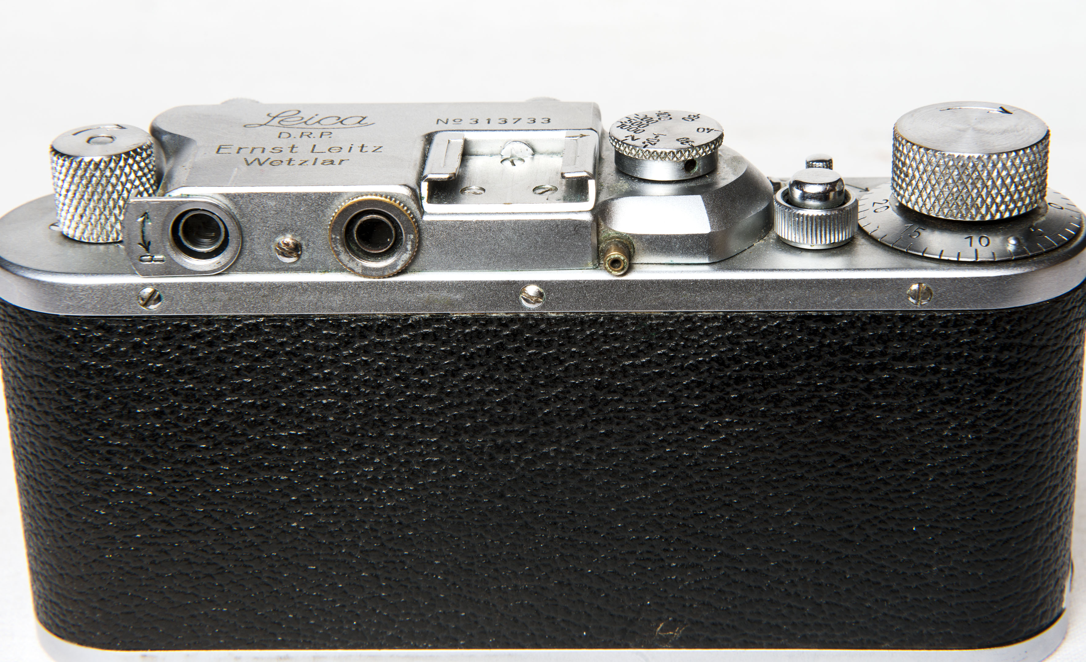 This Leica III has been modified by a barrel of fast speeds brought up to 1/1000 and by the addition of a flash synchro socket on the back of the camera.