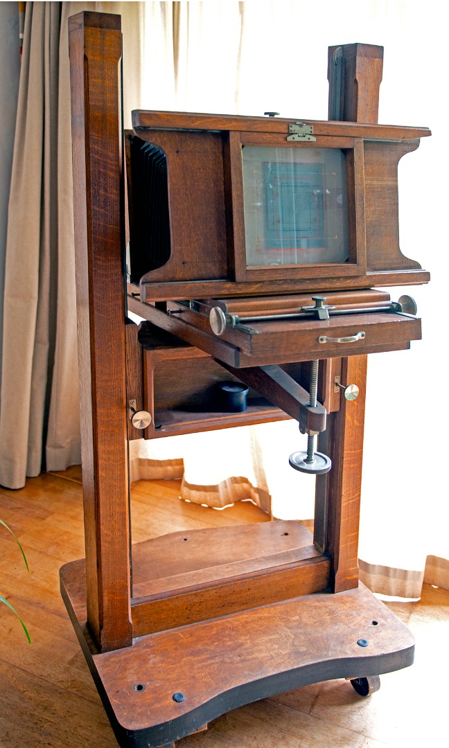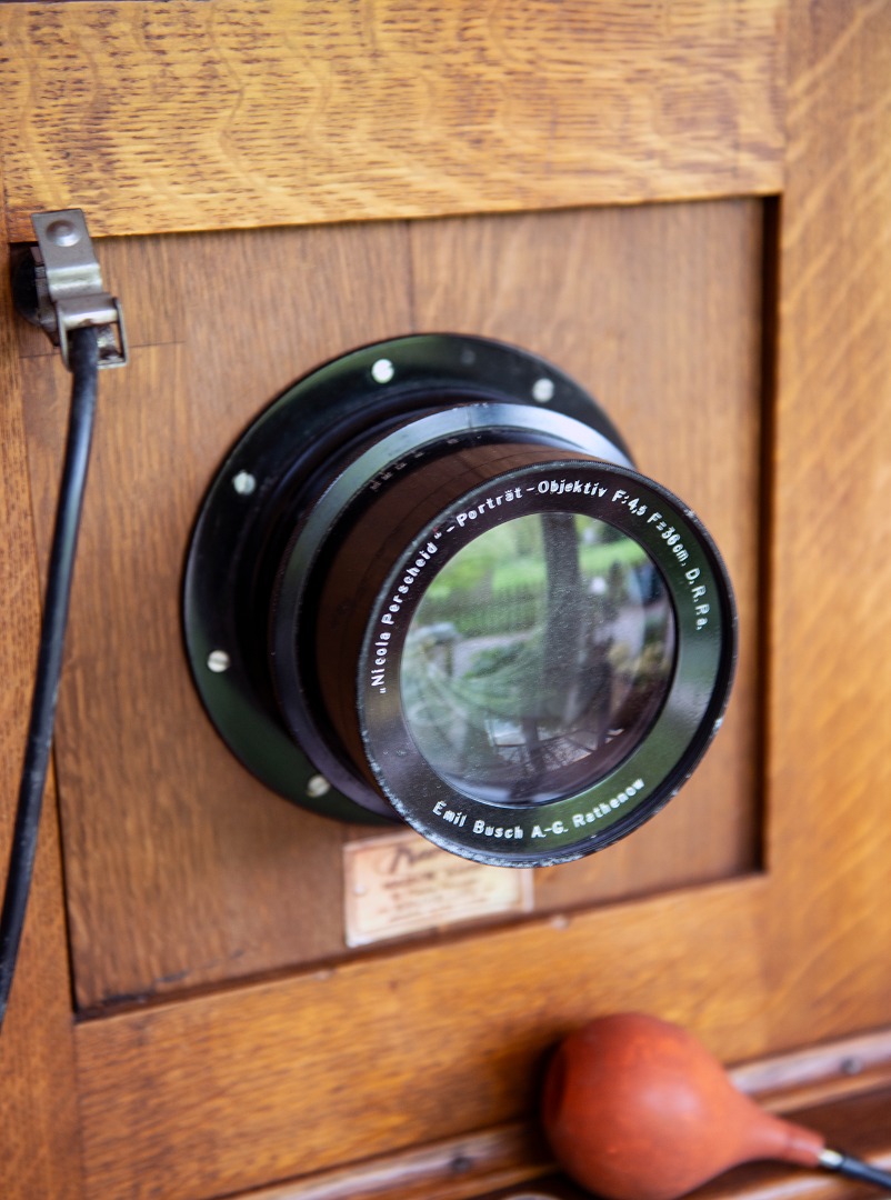 Regarding this studio camera, the wheels are not all original and the foot stabilizer is missing. The photographic chamber goes up and down between the two columns by a system of two lead counterweights which each slide inside the columns. The load of the counterweights and the chamber are equalized which allows the raising and lowering of the chamber with one hand. Grundner's shutter is in the bellows, just behind the optics. It is a half-sphere which opens in two by the pressure of the air sent by the pear. An external accessory can block the air pressure to keep the hemisphere open while framing and focusing the subject. The firm Naert offered a Voigtlander Heliar lens with a 36 cm focal length. This camera having neither a mounting board nor an optic, I placed a Nicola Perscheid Porträt 4.5 / 36 cm on a 'home-made' board made of oak, like the rest of the camera. The builder's plate is a photo reproduction of an original.