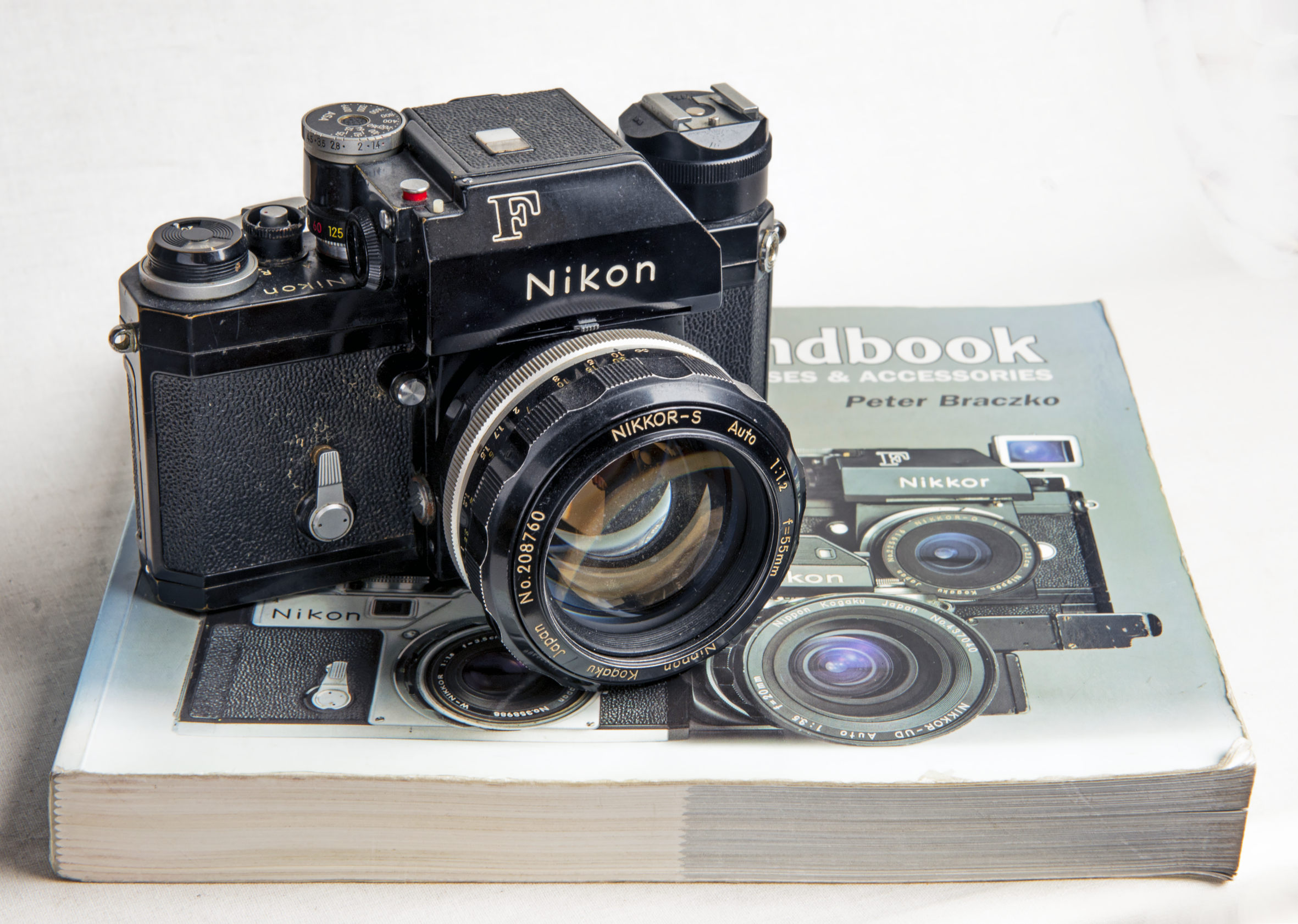 Below the Nikon F photomic Tn with the book " The Nikon Handbook " by Peter Braczko