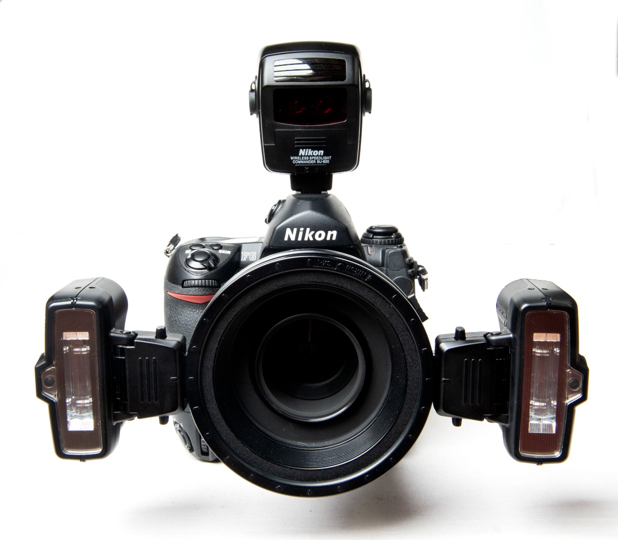 Below, the camera is presented with the R1C1 macro flash kit for the CLS (Control Lighting System): the SU-800 controller and the two SB-R200 flashes.