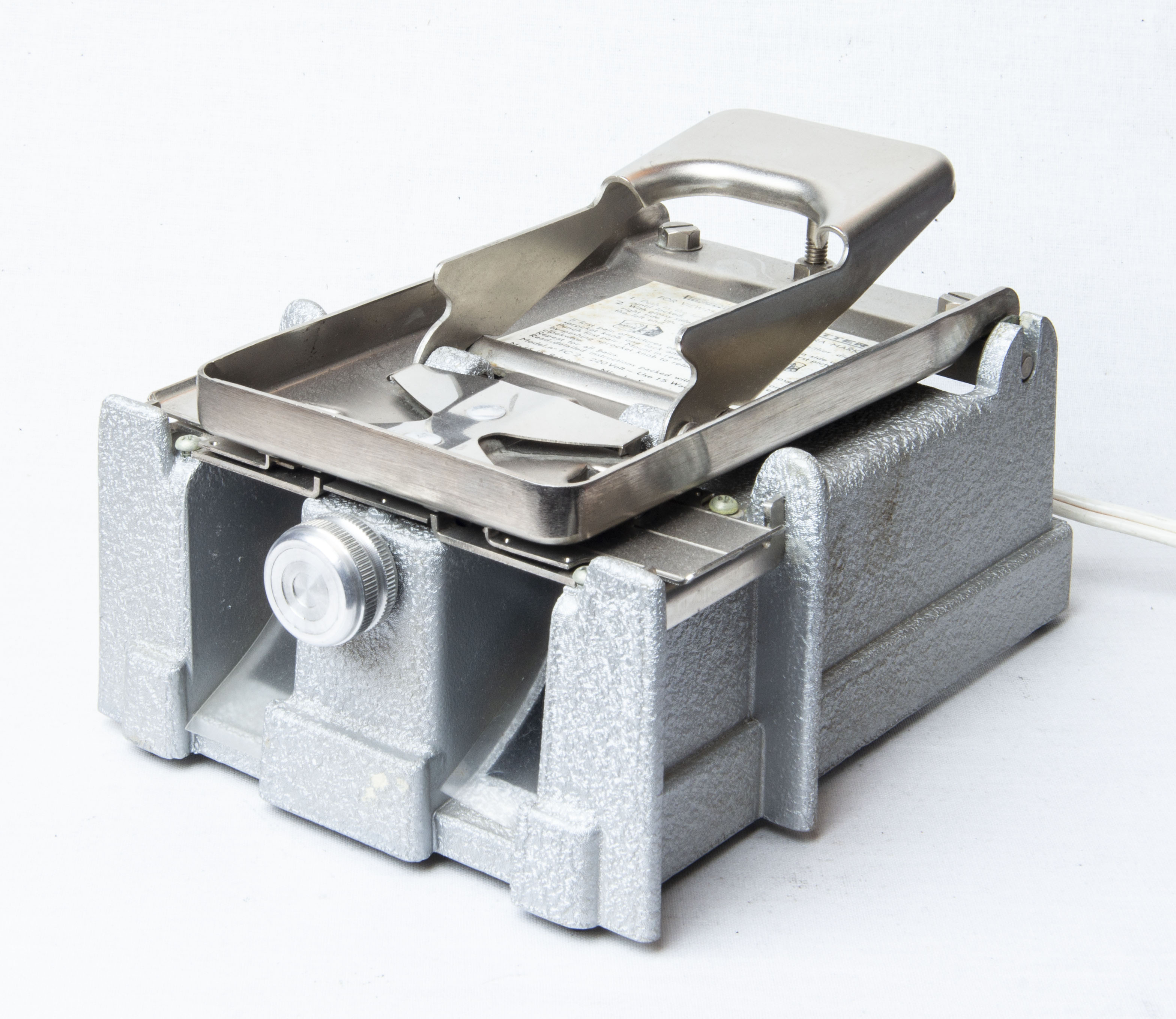 Machine à éclairée électriquement et qui sert à découper les vues doubles dans le film 35 mm prises avec les appareils stéréo de la marque View-Master. Ces vues sont placées en face l'une de l'autre dans les disques en carton vierges et pré-découpés.