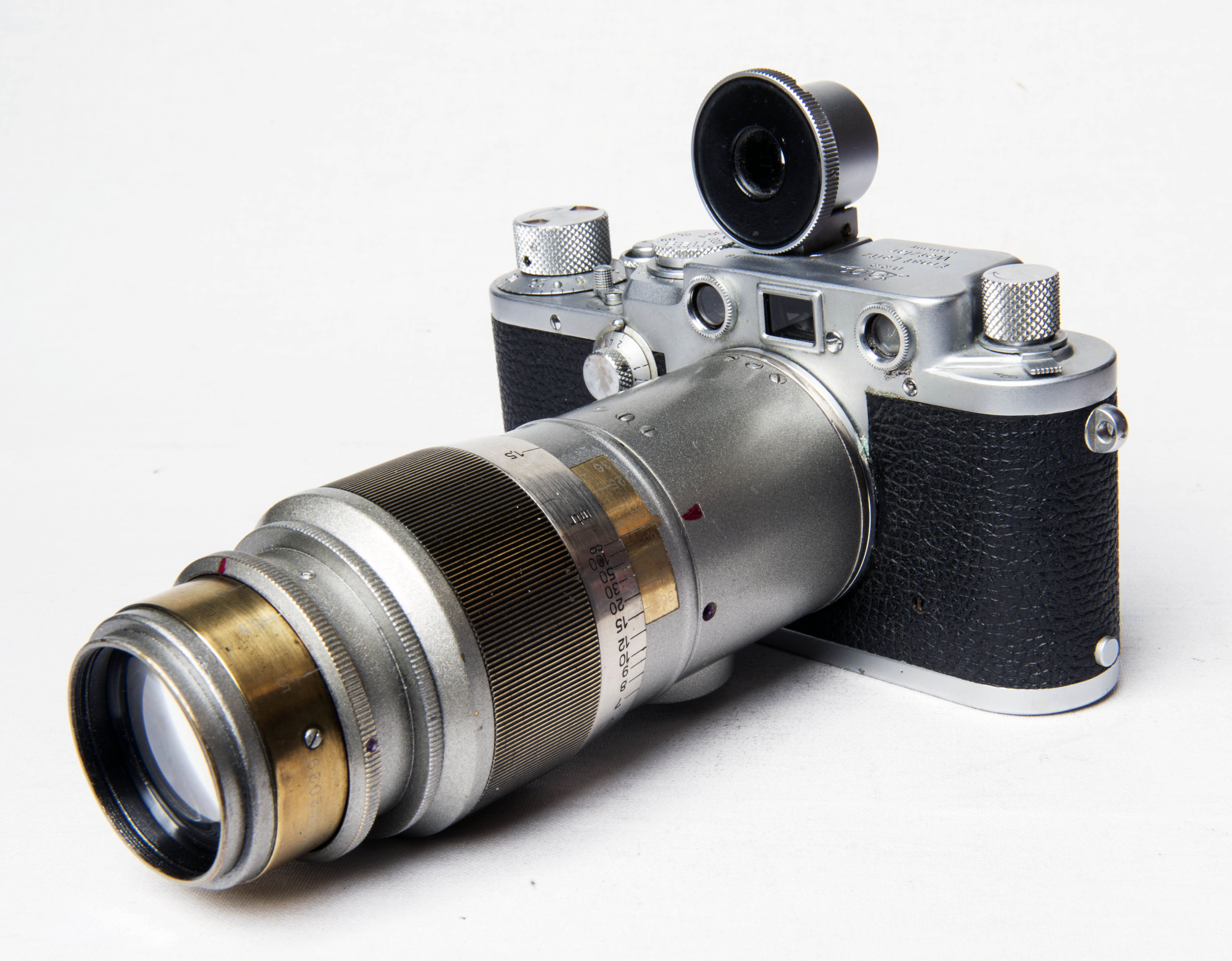 Ci dessous, le Leica IIIf avec l'optique Elmar f1:4.5 / 13,5 cm N° 142039 de 1932 et le viseur (SHOOC) 135 mm de 1951