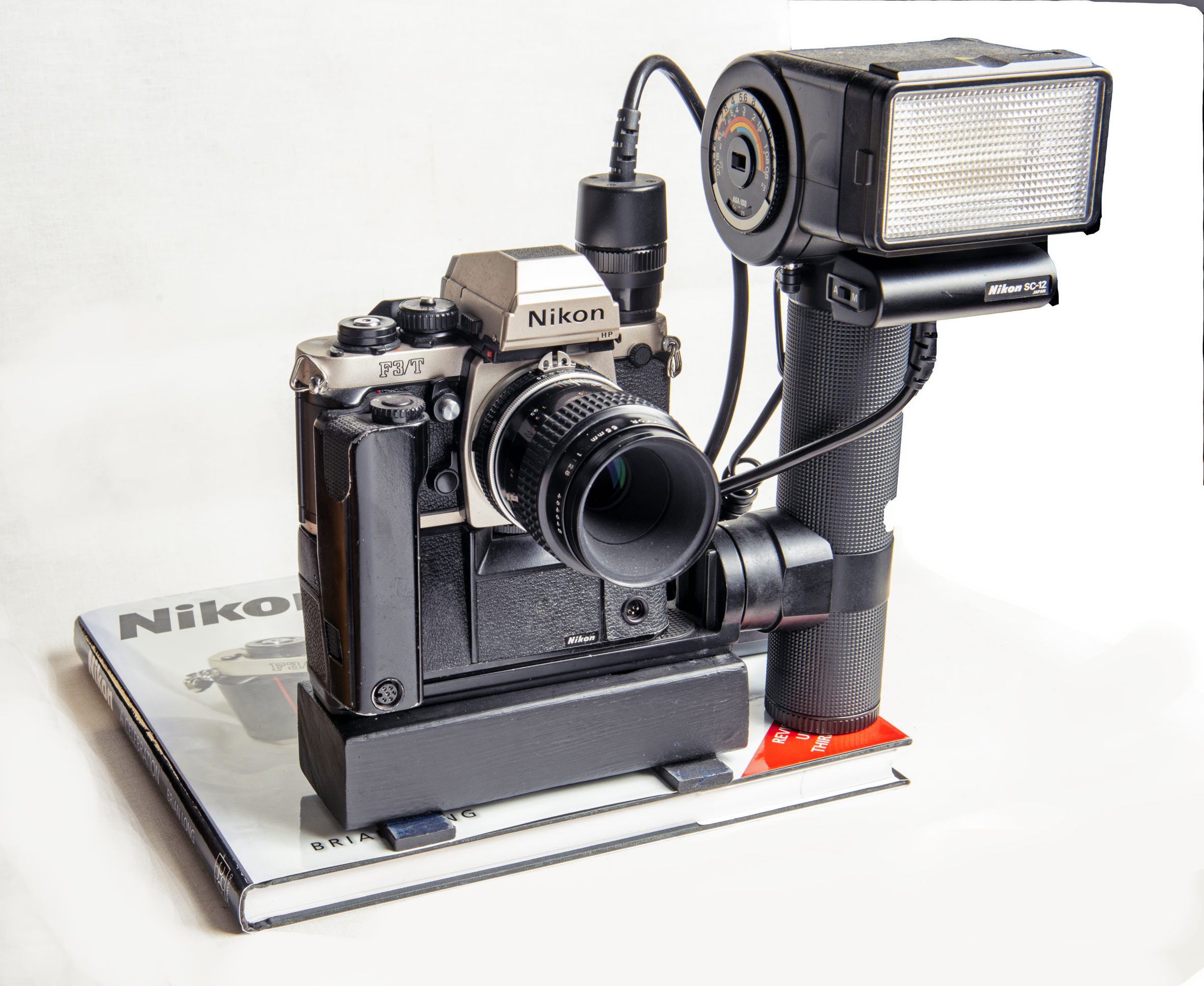Ci dessous, le Nikon F3 / T muni du flash SB-11 de 1980, du câble de connexion SC-12, du générateur rapide SD-8 (non visible sur la photo) et du moteur MD-4 dédié au F3.