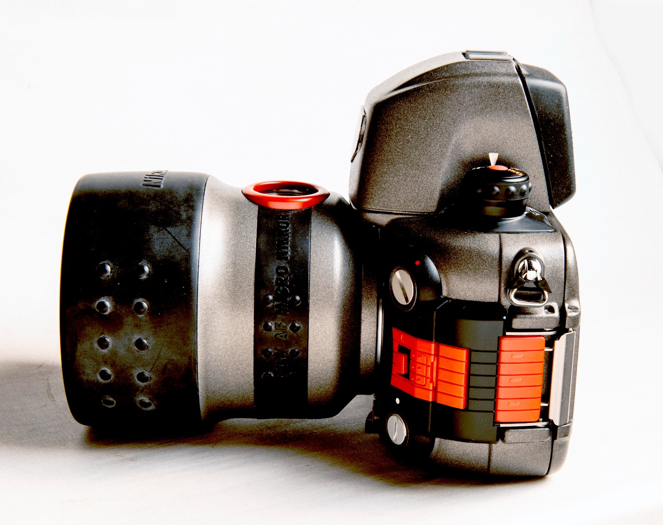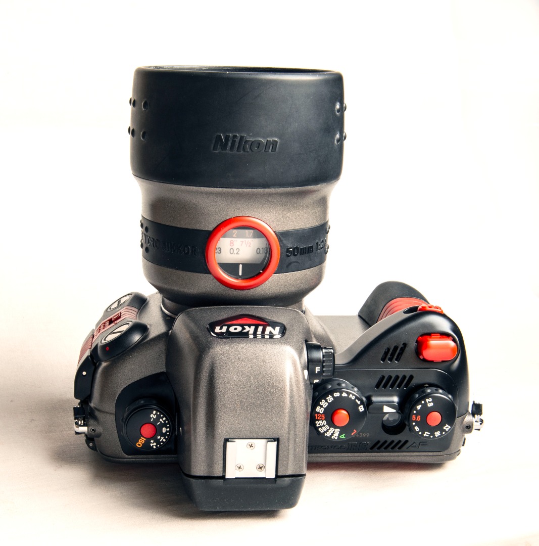 Nikon Nikonos RS, dernier de la série des Nikonos. Toujours argentique mais autofocus, visée reflex et la profondeur d'utilisation sous l'eau passe à 100 mètres. Boitier costaud, à toutes épreuves et d'un poids de 3Kg234, complet avec l'optique 50 MM. Sous l'eau, il est plus léger ! Monture à baïonnette pour Les objectifs R-UW 13 mm, 28 mm, 50 mm et zoom 20.-35 mm dédiés. Une pile 6 V alimente le motorisation de l'avance/rebobinage du film, l'autofocus et le contrôle d'exposition par lr posemètre intégré.